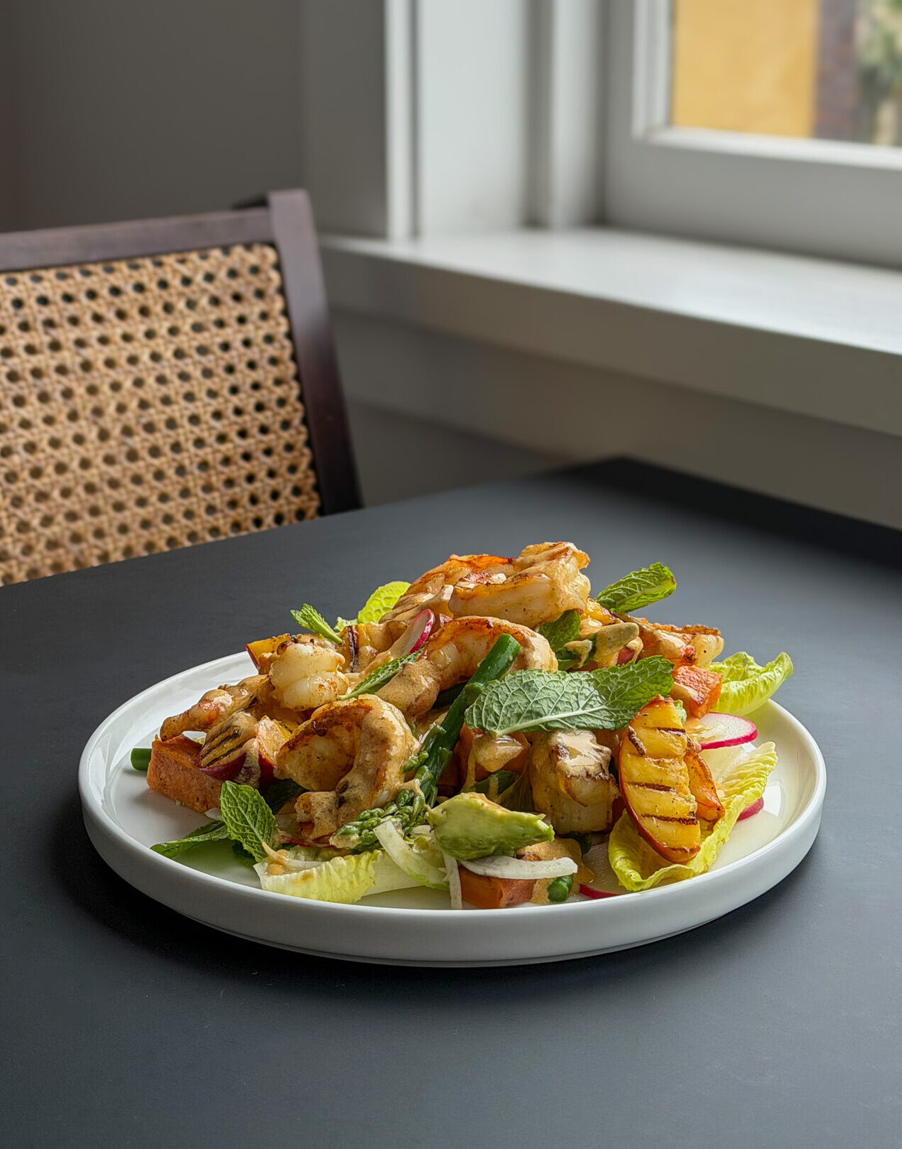 Summer Prawn & Peach Salad with Hot Sheep’s Yogurt Cocktail Dressing