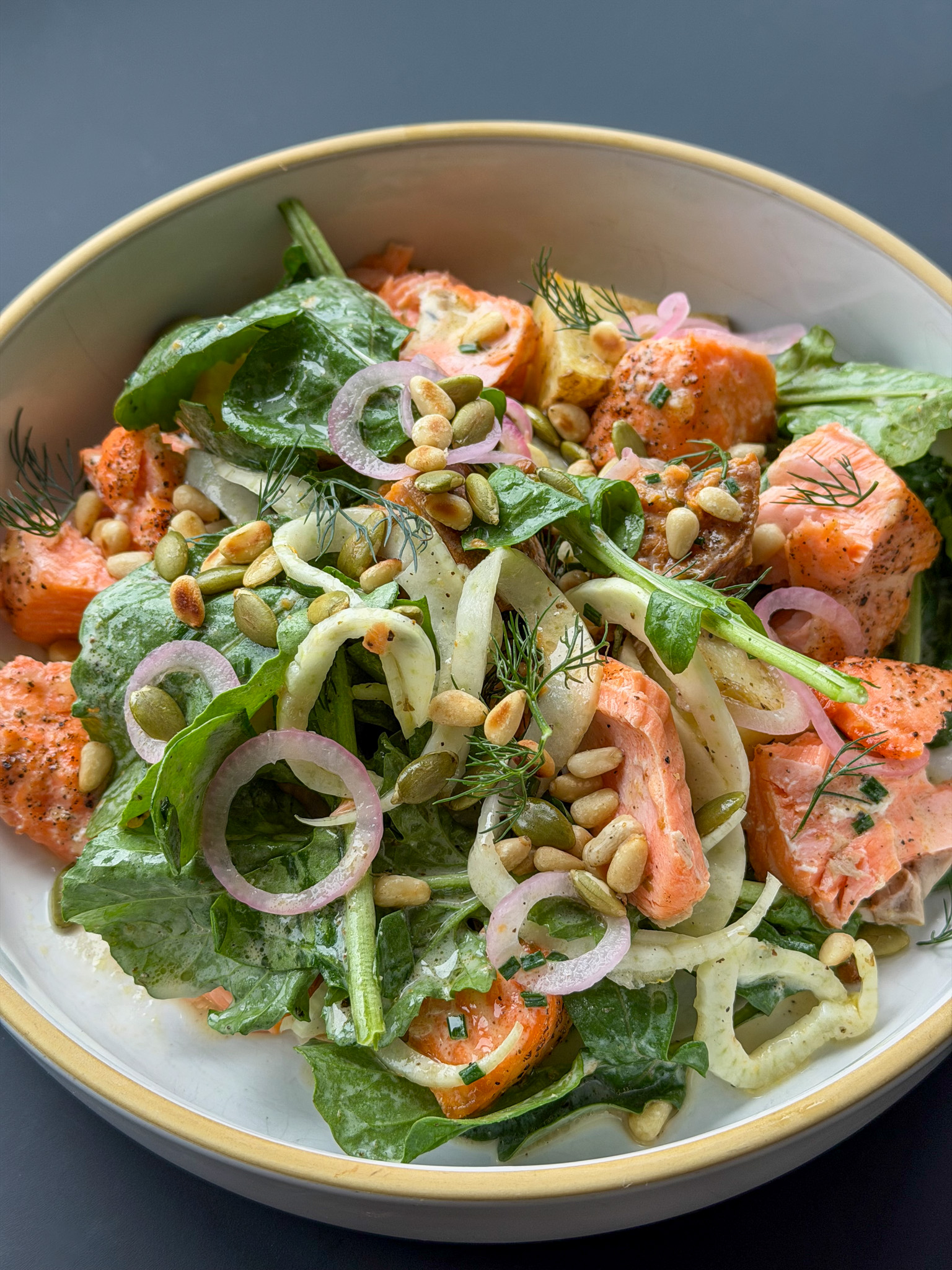 I’ve just come back from an incredible food trip overseas, and the first thing I crave isn’t restriction but fibre and flavour that ease me back into my routine. Eating well has never been about eliminating anything for me; it’s about meals like this Roasted Salmon and Potato Salad with Kefir Dressing—fresh, satisfying and genuinely delicious.