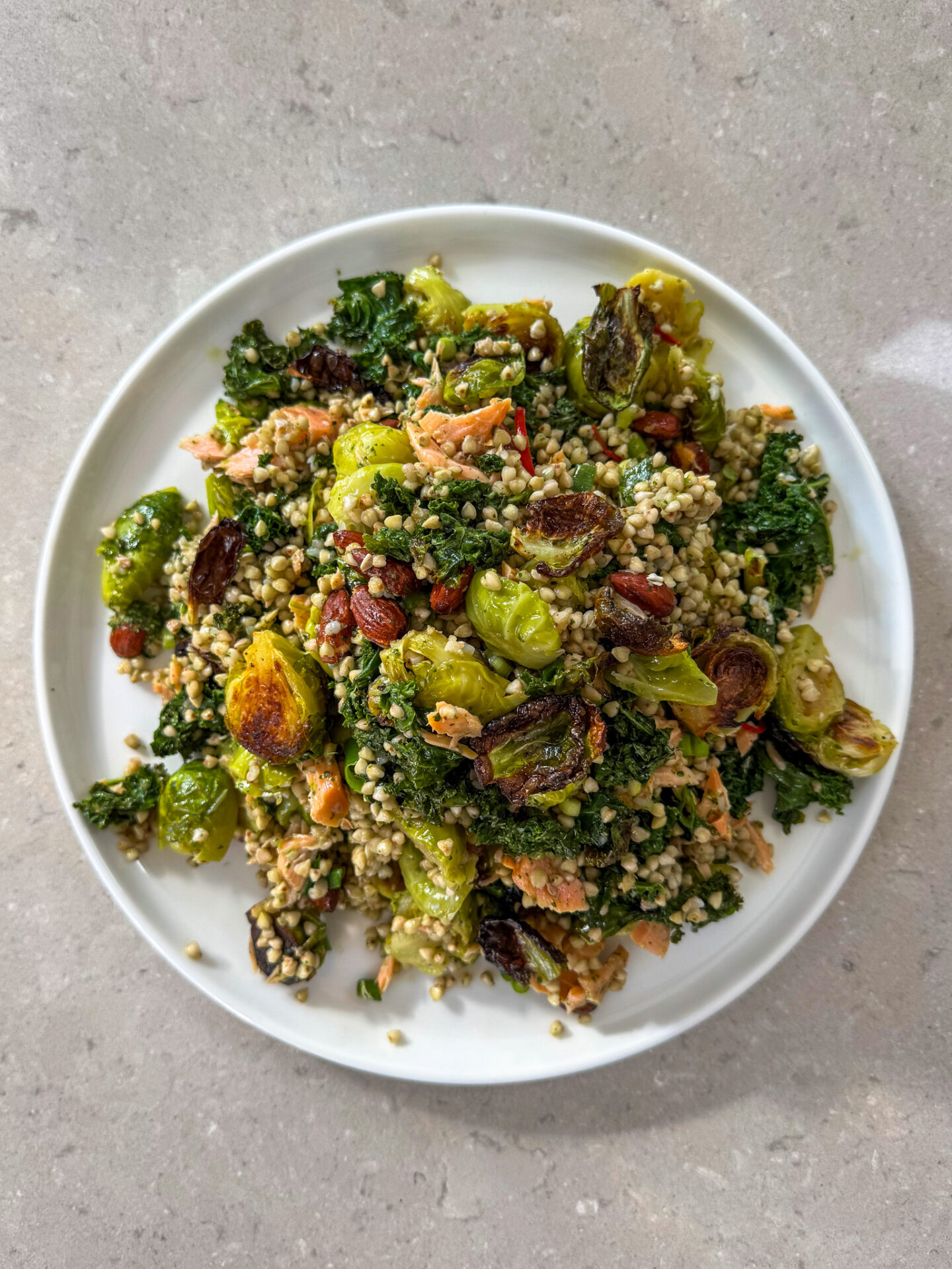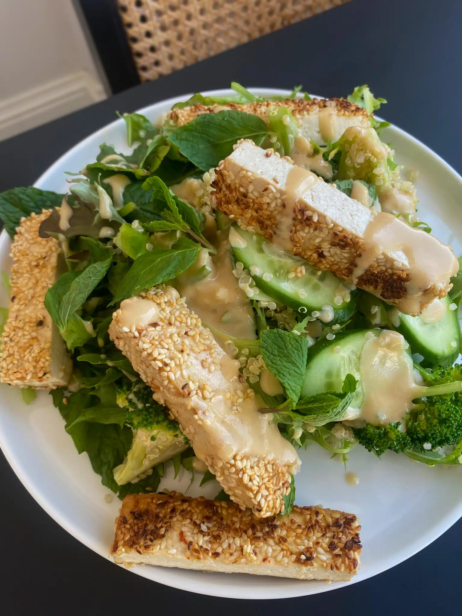 This one goes out to my plant-based friends! A sesame crusted tofu ‘schnitzel’ salad, full of green things, slow digesting grains and the BEST miso tahini dressing. It’s low on the grease, BIG on the crunch and will keep your blood sugar in check for hours.