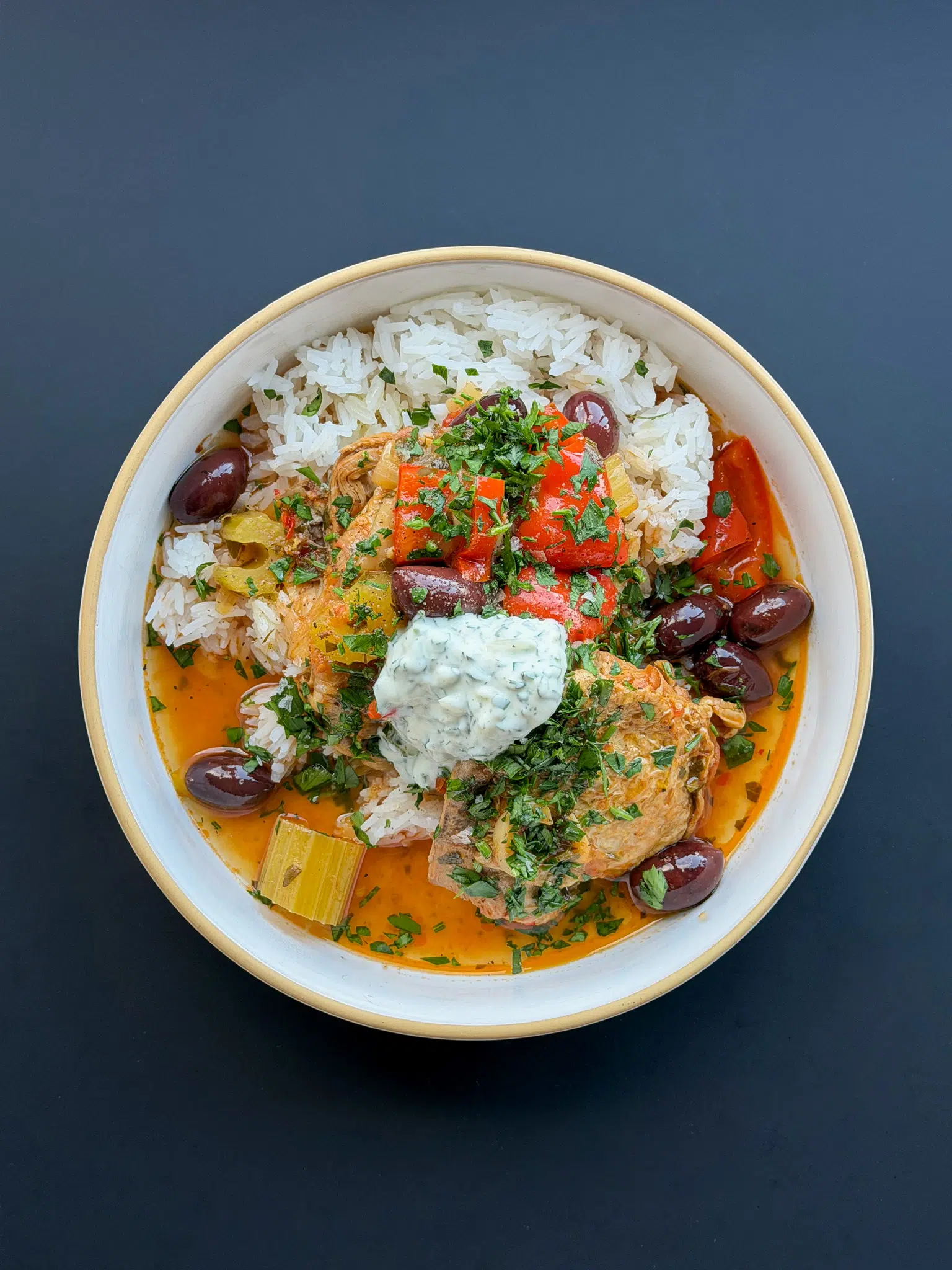 This Spanish Braised Chicken with Olives is calming, deeply tasty, and wonderfully gentle on the gut. Served over soft, fluffy rice with a spoonful of cool herby yogurt, it’s exactly the kind of dish that welcomes you home and heals you from the inside out.