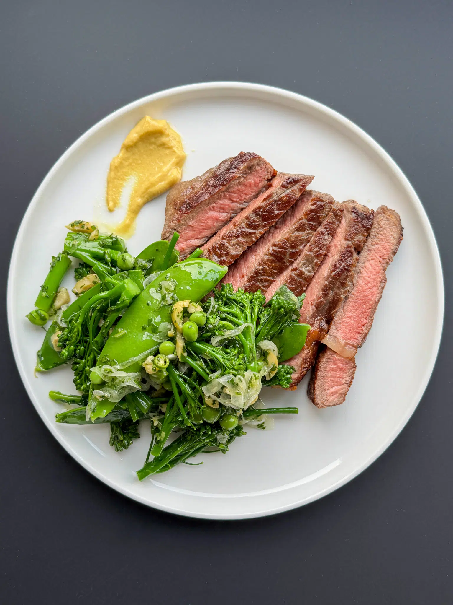 Midweek dinner’s don’t have to be complicated to be delicious! This is a scotch fillet steak, cooked to perfection with cold crunchy greens in a Sicilian olive dressing. Though it seems ‘simple’, it really packs a flavour punch by using the whole olives plus their brine (aka the most perfectly-seasoned vinegary liquid we should all be keeping and NOT throwing in the bin!).