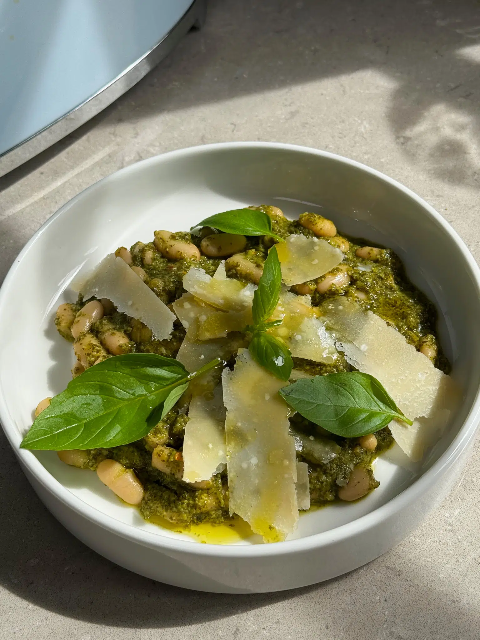 I don’t think i’ll ever get tired of canned beans. They are cheap, require minimal preparation (if any) and are chock full of plant protein, as well as prebiotic fibre to feed a healthy gut microbiome. This vegetarian-friendly bean recipe has been on rotation in my house as of late – little cannellini swimming in creamy green sauce packed with kale, peas, garlic and just a hint of chilli. Top it off with shaved parmesan and a good glug of extra virgin olive oil. This is humble and nourishing every day food to feed the soul (and your body).