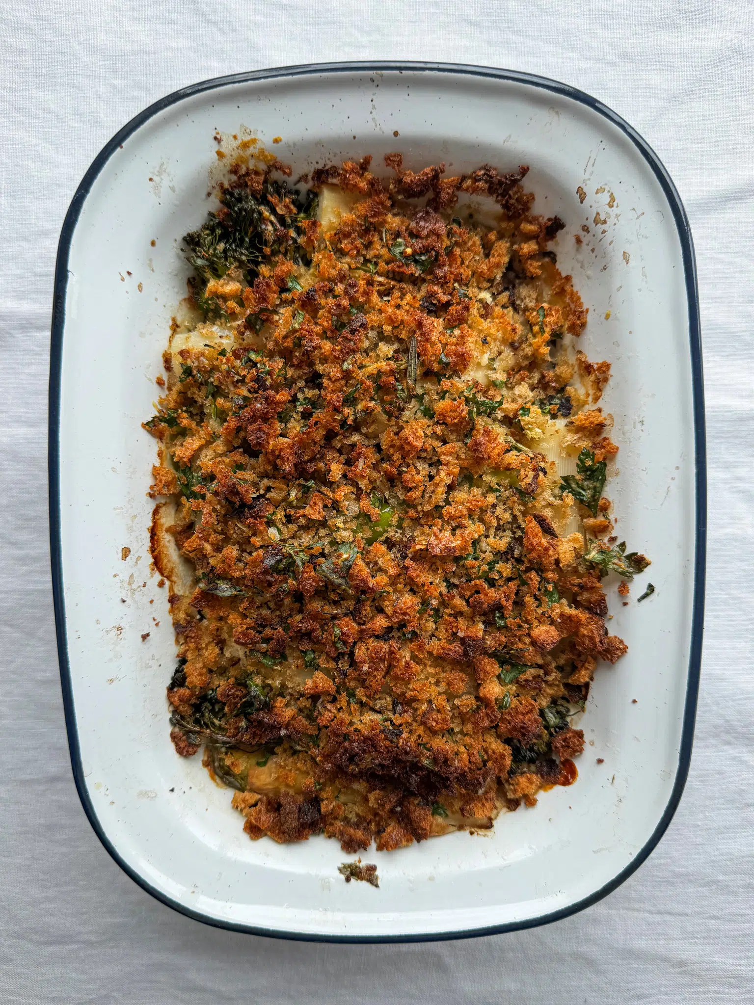 White asparagus is one of my all time favourite vegetables – it’s the perfect mix of tender and sweet, yet is robust enough to hold itself in this healthier parmesan gratin, topped with a crunchy rye sourdough crust. If you can’t get your hands on it, don’t fear! This recipe calls for jarred white asparagus which you can generally find at any good food providore or grocer, however, do feel free to use good old regular green asparagus. This recipe is slightly lighter than traditional gratin, yet still super cosy and comforting on a cool evening. A perfect excuse to use up that stale bread or whatever veg you have lying around.