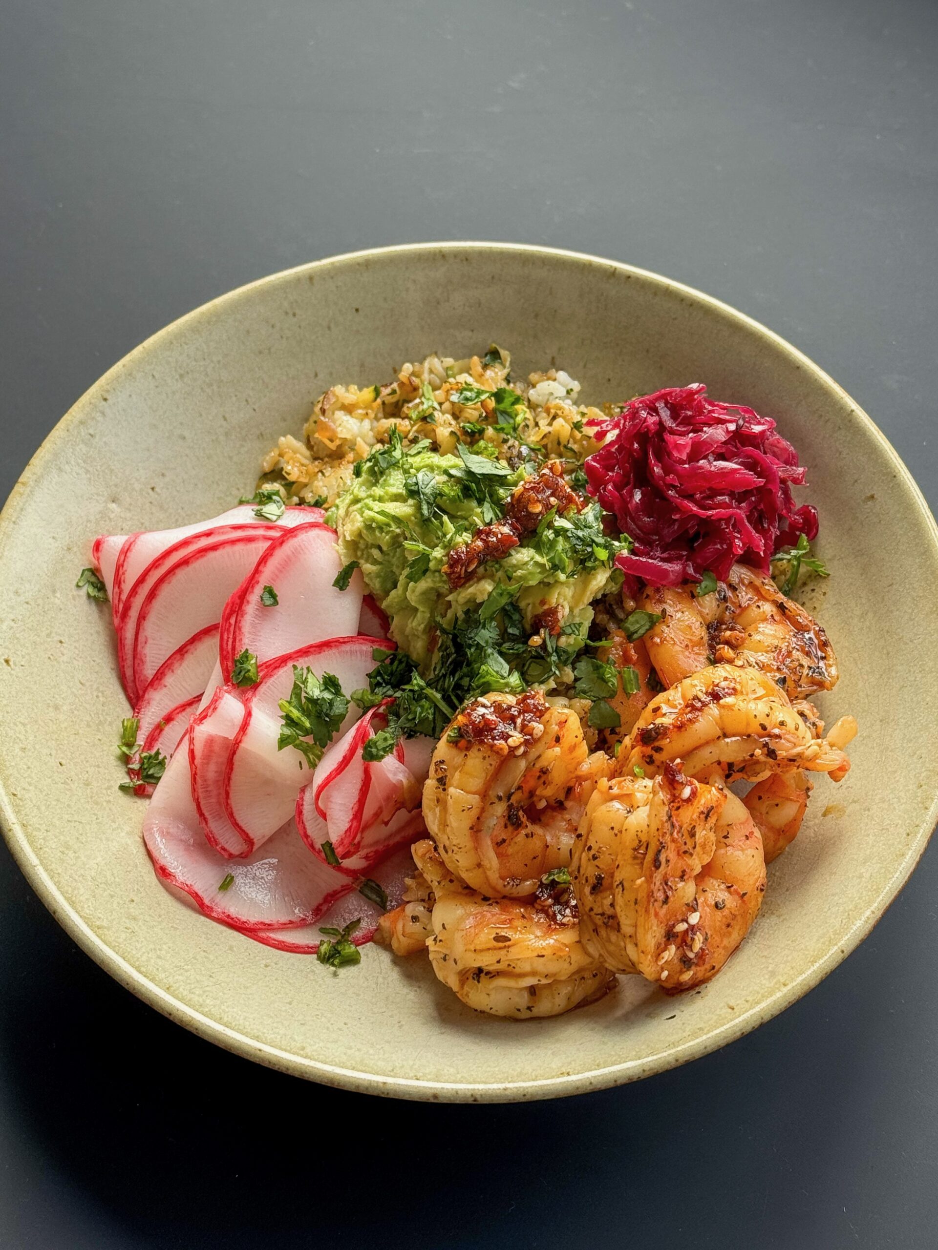 No healthy lunch bowl is complete without toppings. I added a quick radish pickle—sharp and crunchy after just fifteen minutes in vinegar and maple—along with smashed avocado with lime, a spoonful of sauerkraut for tang and gut health, and a scattering of fresh coriander. A final drizzle of chilli oil brought the whole thing together.